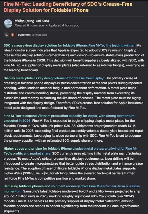 郭明錤还表示,Fine M-Tec 预计将于2026年第一季度开始出货折叠iPhone用显示器金属板。该金属板的单价约为30-35美元,2026年的出货量预计达到1300万至1500万个。