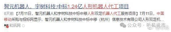 智元机器人联合宇树科技中标中国移动子公司人形机器人代工服务项目,总预算1.24亿元,创下行业联合中标金额纪录。