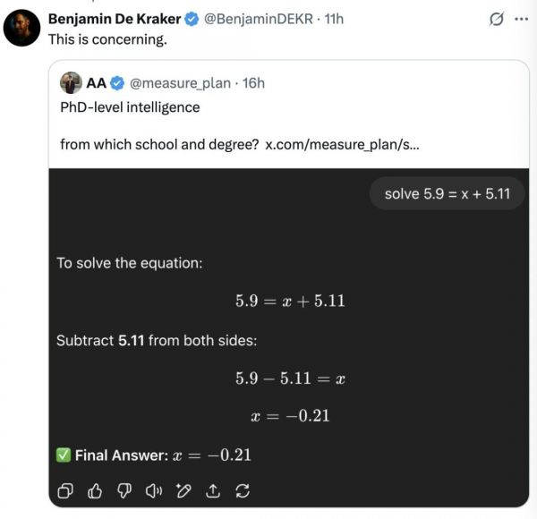 一位 X 网友发现 GPT-5 在解决可能属于小学水平的数学题时无能为力,吐槽到底被官方称为「博士」水平的智力是哪个学校颁发的?