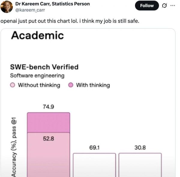 而不出所料,Sam Altman 也被问到了发布直播上令人尴尬的一幕,展示出模型性能图表出现「错误」—— 该图表显示的基准分数较低,但条形图却很高。