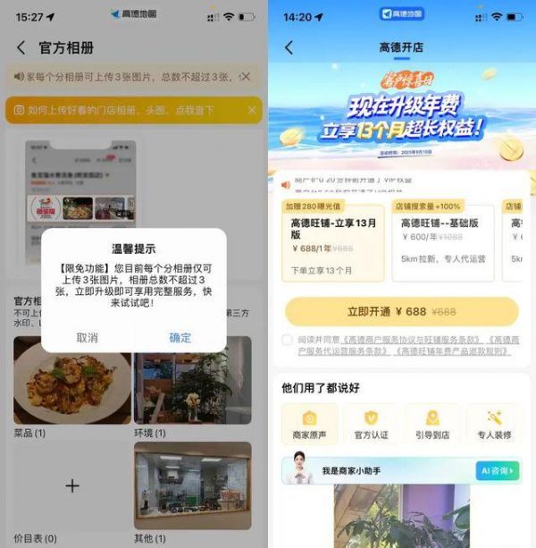一名咖啡简餐商家就向「定焦One」透露,在申请入驻高德商铺时,很多信息需要开通“高德旺铺”才可以填写,如设置管理团购活动、分发优惠券、上传和更新商品信息等,甚至在没有开通的情况下,门店照片只能上传三张,目前开通界面显示“高德旺铺”基础版本为600元/年,688元/13个月。