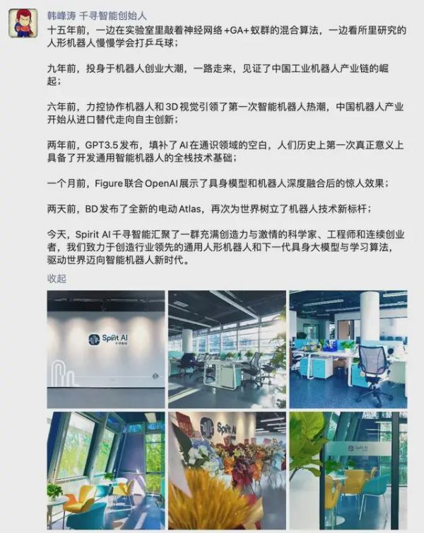2024 年 4 月,千寻从孵化器搬到新办公室,韩峰涛在朋友圈回顾了过去的从业经历和中国机器人行业的变化。