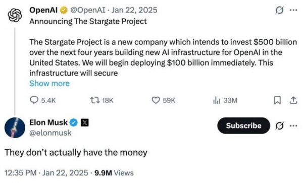 5000亿“星际之门”?马斯克:OpenAI没钱,软银也就不到100亿美元