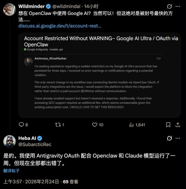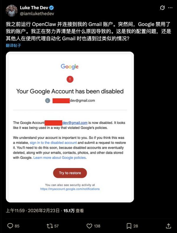 谷歌开始大面积封禁OpenClaw用户账号!