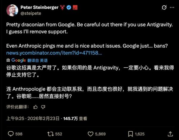 面对这种级别的封锁,Peter Steinberger 的回应同样决绝,他立刻宣布 OpenClaw 将在此后的版本中彻底剔除对谷歌架构的支持。