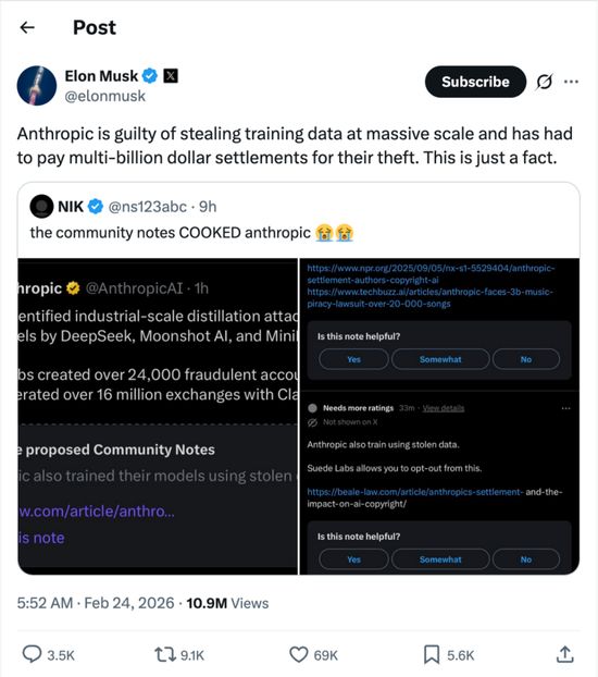 此次事件一出,Elon Musk 在X上隔空抨击Anthropic大规模盗用训练数据,发帖直言, Anthropic 本身也曾因训练数据问题饱受争议,并讽刺称:“你偷来的东西被偷了?”