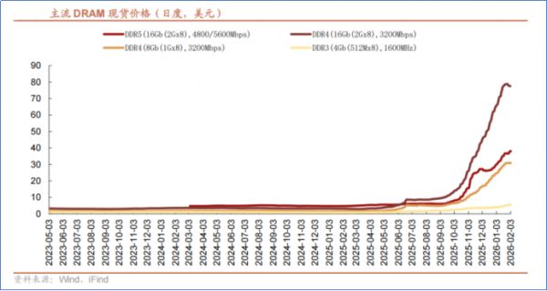 以16Gb DDR4颗粒为例,其现货市场价格从2025年年初的2美元左右,一路飙升至2026年1月的80美元以上。