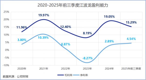 2021年至2024年,公司的毛利率经历了从19.79%下降至8.19%后再反弹至19.05%的起伏,2025年前三季度又降至15.29%。