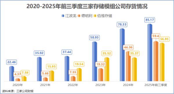 截至2025年前三季度,江波龙的存货金额攀升至85.17亿元的历史高位。这一存货规模远超德明利、佰维存储等同业。