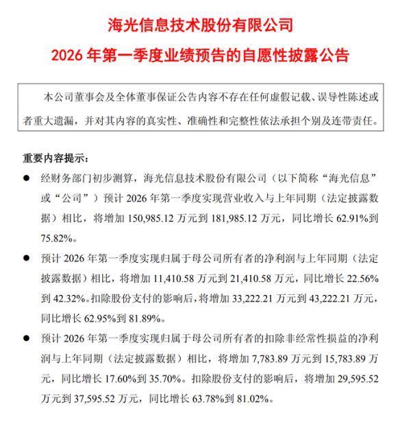 更让人振奋的是2026年第一季度的预告,海光这次相当自信,直接来了个“自愿性披露”,通常只有对业绩特别有信心才会这么干。