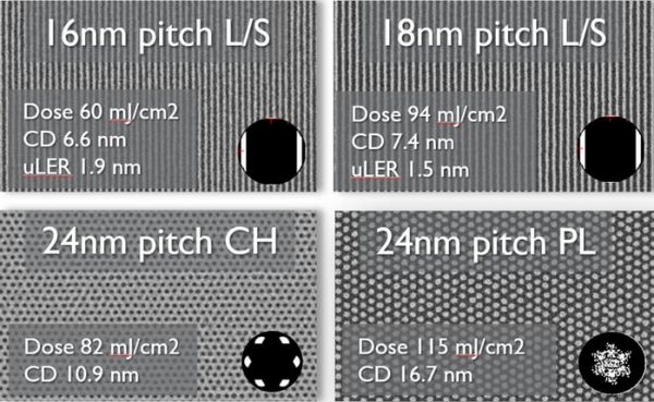 2024年,imec在ASML-imec高数值孔径EUV光刻实验室中,利用0.55NA EUV光刻扫描仪(TWINSCAN EXE:5000)实现了16nm间距线/空的单次打印图像,创造了世界纪录[5,6]。这些图像打印在专为高数值孔径EUV光刻优化的金属氧化物光刻胶(MOR)上。同样,接触孔(打印在化学放大光刻胶(CAR)上)和柱状结构(打印在MOR上)也展现了令人瞩目的24nm间距(中心距)分辨率。