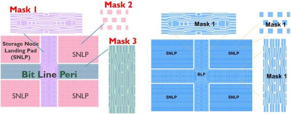 高数值孔径极紫外光刻技术能够省去复杂的多重曝光步骤,使其成为未来DRAM节点(例如32nm (D1d) 和28nm (D0a) DRAM)发展路线图的关键技术。对于这些节点,实验已证实使用高数值孔径极紫外光刻技术对BLP/SNLP层(包含位线外围和存储节点焊盘的层)进行图案化的可行性[4]。0.33NA极紫外光刻技术至少需要三个掩模才能完成BLP/SNLP层的图案化,而0.55NA极紫外光刻技术仅需一个掩模即可完成相同的任务。