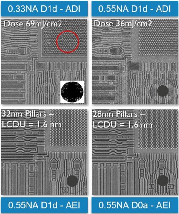 高数值孔径(NA)极紫外(EUV)光刻扫描仪中,投影透镜接收到的光线具有比低数值孔径(NA)EUV扫描仪更多的衍射级次。这增强了空中图像的对比度——即光线穿过光掩模后明暗区域之间的强度差异——这也是其分辨率更高的原因。当光刻胶曝光于对比度更高的图像时,印刷特征具有更好的局部关键尺寸(CD)均匀性(LCDU),并且粗糙度更低。这一结论已通过对各种29nm间距的六边形孔和柱状结构的实验验证,结果表明,与0.33NA印刷特征相比,LCDU提高了18%至42% 。