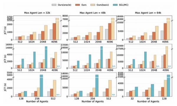 在大规模可扩展性方面,DualPath系统在最多1152张GPU上进行了验证。离线推理从2P4D(2K智能体)扩展到48P96D(48K智能体)实现近线性扩展,任务完成时间基本保持一致。