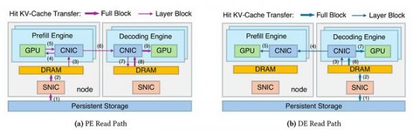 对于解码端读路径,命中KV首先加载到解码引擎缓冲区,在预填充引擎执行预填充时逐层通过RDMA读取,同时与计算重叠。未命中KV计算完成后回传至解码引擎,与命中KV合并形成完整提示词缓存。