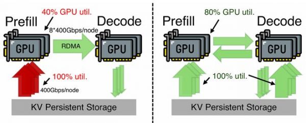 现有系统采用分层预填充、预填充-解码分离(PD分离)和外部KV缓存存储架构。但问题在于:预填充引擎存储网卡带宽持续饱和,而解码引擎存储网卡带宽大量闲置。这种不平衡暴露了根本性低效——存储网络带宽利用不均,而单纯增加预填充端带宽成本高昂。