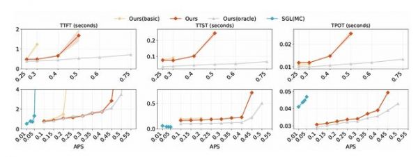 在改变追加长度和生成长度时,DualPath在短token场景下优势更明显。随着追加长度增加,GPU计算压力增大,而生成长度增加则因预填充间隔变长,降低了KV缓存加载压力。
