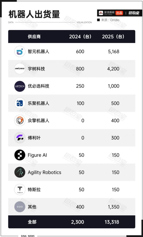 今年1月,研究机构Omdia的数据显示,2025年全球人形机器人出货量达到1.3万台,标志着这一品类正从样品走向商品,在多场景下加速落地。更值得关注的是,中国企业在这一轮爆发中占据了绝对主导:智元机器人以5168台的出货量拿下全球近四成份额,宇树科技和优必选紧随其后,三家合计吃掉全球六成以上市场。