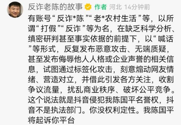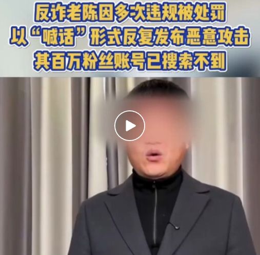 反诈老陈抖音账号被封禁,官方指其借打假煽动对立