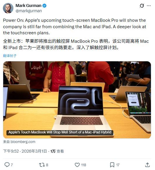 古尔曼:苹果坚持Mac与iPad独立,触控版MacBook Pro定档2026年底