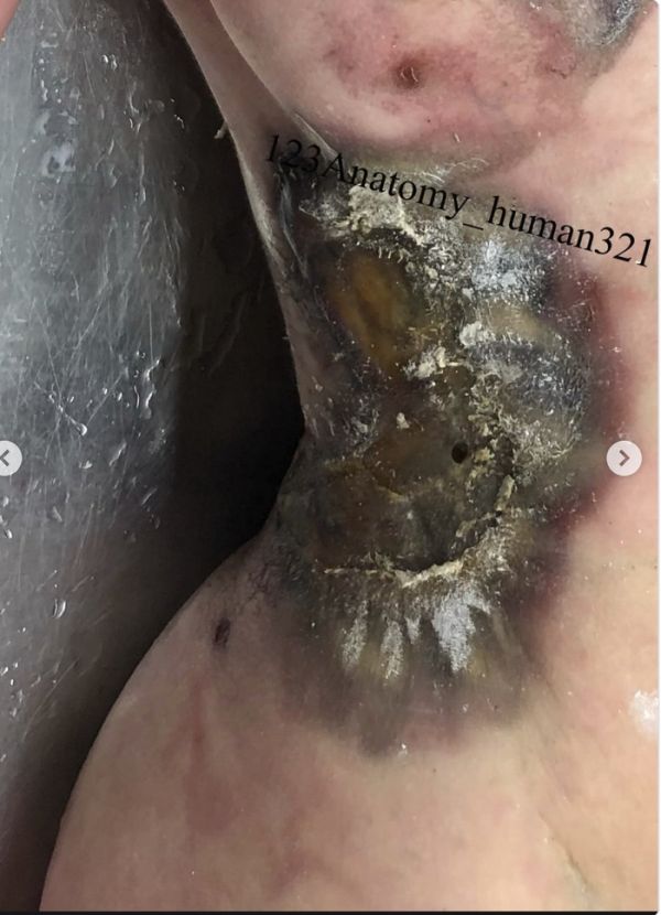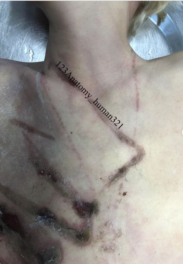 ⚡️ 胸口处的电击痕迹是典型电损伤特征,是电流进入或流出人体的位置留下的印记。表现为皮肤坏死性损伤,多呈椭圆形或圆形,灰白色,边缘隆起、中心凹陷。这类痕迹由电流产生的焦耳热与电解作用形成,常见于100–250V电压环境。本案中,胸口上与 iPad 轮廓一致的痕迹,表明触电瞬间设备与皮肤直接紧贴。