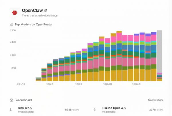 OpenRouter平台数据显示,2026年2月,中国模型在全球Token消耗中占比达61%,历史上首次超越美国,MiniMax M2.5、智谱GLM-5、月之暗面Kimi K2.5位列调用量前三。这组数据背后,是性价比带来的规模化效应,当AI使用成本大幅降低,无数垂直场景被激活,从企业数字员工到个人创作助手,从代码生成到文案处理,AI真正融入日常生产生活。