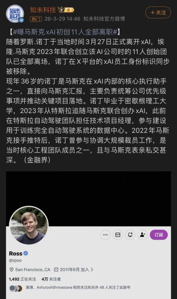 近日,外媒爆料称 xAI 初创团队的 Ross 也离职了,至此 11 人初创团队全离职了。