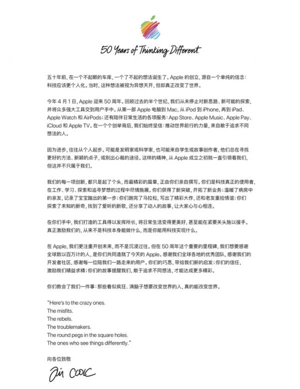 【IT168原创新闻】美国当地时间4月1日,苹果公司迎来了成立50周年纪念日。苹果CEO蒂姆·库克接受了《华尔街日报》采访,并向全体员工发表了一封内部信。