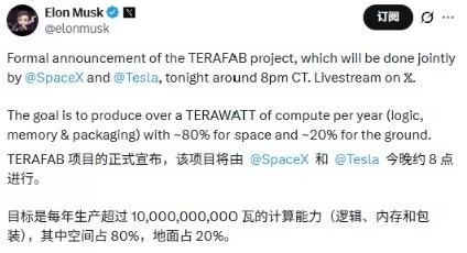 另外,Terafab 项目的目标是实现每年超过 1 太瓦(terawatt)的算力产能。这一规模远超地面电力承载能力,为此马斯克提议将80%的算力产能将用于太空算力网络,剩余20%产能则面向特斯拉自动驾驶、人形机器人等地面应用需求。