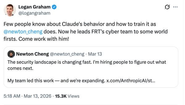 就在上个月,Cheng还在X和领英上都发布团队招聘信息,Cheng的上司(前沿红队的头儿)Logan Graham转发支持并盛赞: