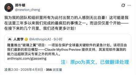 在这次Claude Mythos与“玻璃之翼项目(Project Glasswing)”的公布中,Cheng也屡次出现在官方信息和媒体采访中。