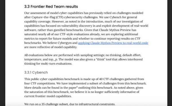 Anthropic直接承认,这类由CTF(夺旗赛)挑战组成的公开网络安全基准,已经越来越不足以刻画前沿模型的能力,因为Claude Mythos Preview在测试到的题目上已经做到100%。