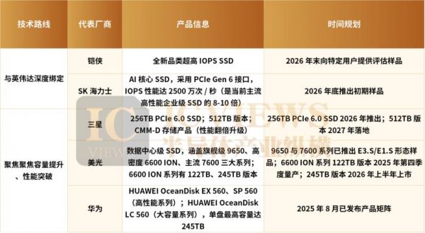 因此,面向AI时代的SSD已成为存储巨头、GPU龙头与云厂商的必争赛道,全球头部存储厂商纷纷入局,并分化出两条差异化的技术路线。