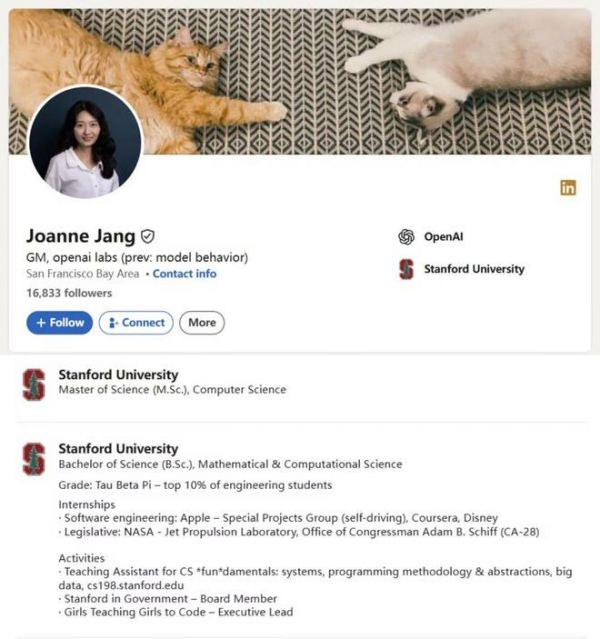 Joanne Jang拥有斯坦福大学计算机科学理学硕士学位和斯坦福大学数学与计算科学理学学士学位。她加入OpenAI时,该公司还只是一个不到200人的研究实验室。