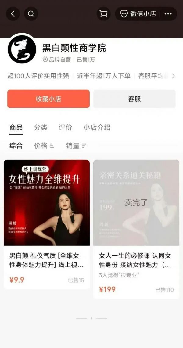 根据网友截图,在复出的新号上,周媛关联的小店依然挂着“黑白颠性商学院”的入口,课程结构熟悉得几乎不用解释: