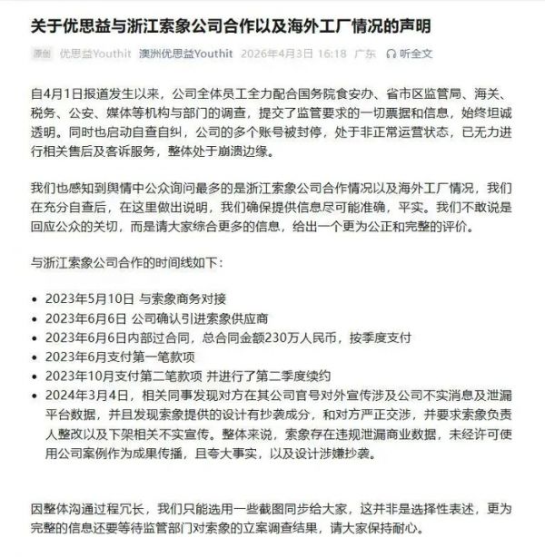 央视曝光当晚(4月1日),优思益通过官方公众号发布首次声明,态度避重就轻、全程甩锅。4月3日,优思益发布第二次声明,进一步切割责任,对消费者无道歉、无赔偿、无退款方案。