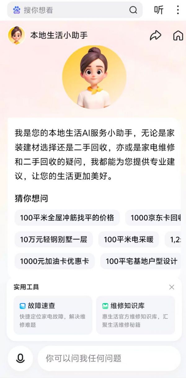 专区内嵌有AI小惠助手,支持语音与文字交互,可直接问价格、比方案、做决策,比如问“附近搬家多少钱”“瓷砖美缝怎么选”,助手会整合信息给出参考,把传统搜索升级为一站式问答和服务推荐,大幅缩短决策路径。但助手目前以信息推荐为主,无法像阿里千问那样,直接完成预约、支付、订单跟踪,服务链路停留在决策前,没能形成闭环。