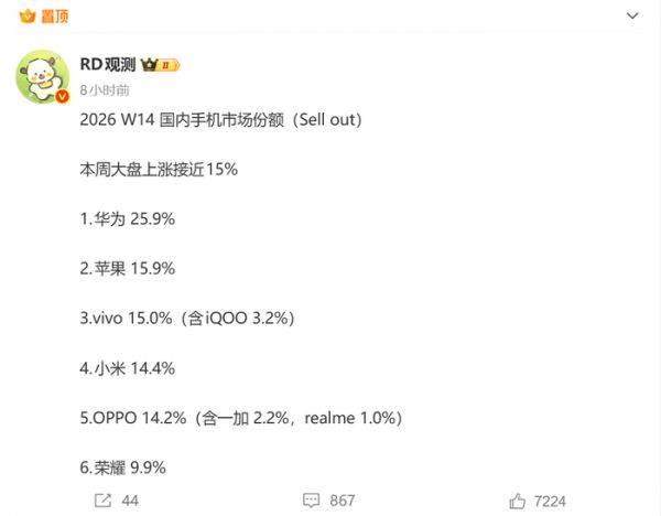 如下所示,这是RD观测发布的2026年W14周的份额数据;