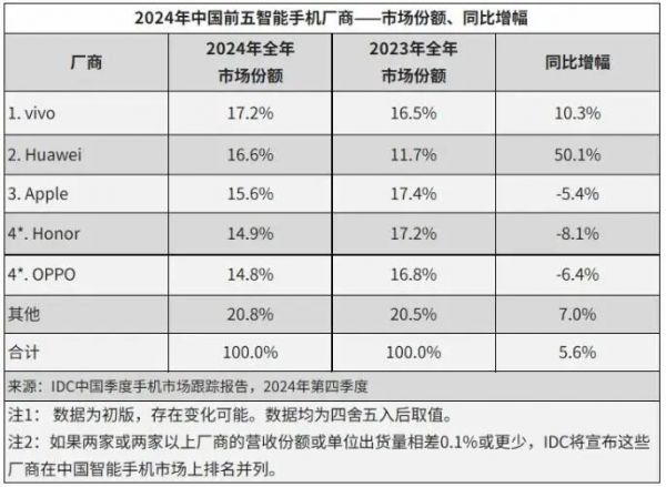 然而好景不长,从2024年开始,荣耀的份额开始大幅下滑,全年只排在第四位,Q4季度更是沦为了Other。