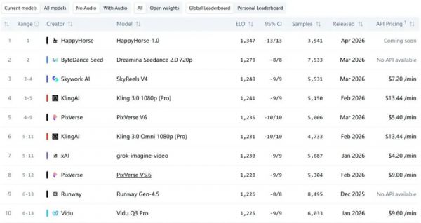 在 Artificial Analysis 的「无音频」排行榜中,HappyHorse-1.0 稳居第一;在其「有音频」排行榜中,其 Elo 分数几乎与字节的 Dreamina Seedance 2.0 相同。