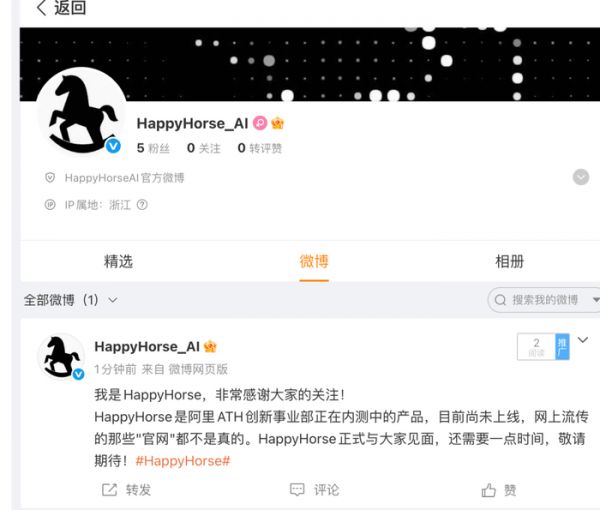 阿里巴巴 ATH 表示:HappyHorse 是阿里 ATH 旗下创新事业部研发的模型,目前正处于内测中,也会于近期开放 API。ATH 创新事业部已启动一个 AI 时代的全新交互方式探索计划,HappyHorse 是这个探索方向的一部分,更多的产品我们会陆续推出。