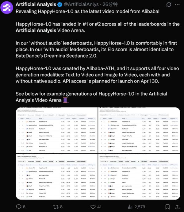 图:阿里巴巴 ATH 也刚刚上线了官方 X 账号。而且 Artificial Analysis 官方账号也公布了这一点:HappyHorse-1.0 在 Artificial Analysis Video Arena 的所有排行榜上位居 #1 或 #2。