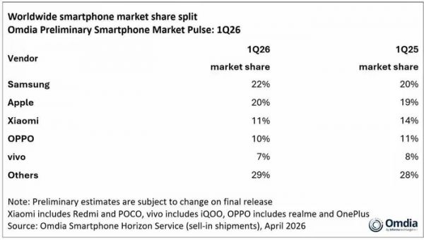 日前,第一季度全球市场智能手机出货量数据已经出炉,可谓几家欢乐几家愁。市场调研机构Omdia的数据显示,三星份额增长较快,市场份额达22%,去年同期份额为20%。