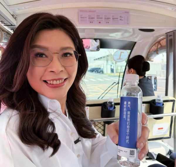 第一张照片中,丽文手中举着一瓶瓶装水,正面是蓝色的标签,用白色字体写着一句话,“勇气,就是我们给这个时代最好的回应”。可以看得出来,丽文非常喜欢这句话。
