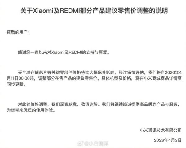 就在4月11日涨价正式生效后,雷军公开真诚发声致歉:“实在抱歉,让大家失望了。我们一直想尽办法扛住成本、守住性价比,但这轮存储芯片涨价幅度太大、速度太快,完全超出了预期。内部能压缩的利润、能优化的成本都做了,最后实在撑不下去,才做出了调价这个无奈的决定。”