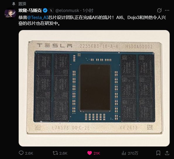 就在一小时前,马斯克在自家社交平台 X 上晒出了一张 HW5.0 芯片实物拍摄照片,称已完成了设计流片。