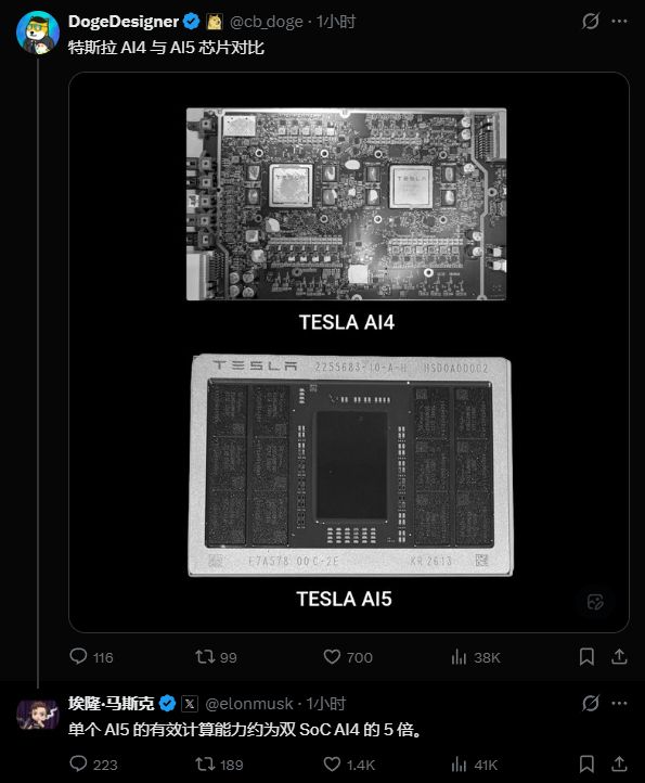 随后,也是引起了热论,马斯克在回复时表示,单个 HW5.0 的有效计算能力约为现有双 SoC HW4.0 的 5 倍。