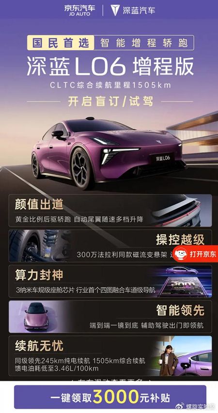 今年,京东跟深蓝汽车合作的“国民好车”则从1.0迈入2.0阶段,双方合作推出深蓝L06增程版,定位为“年轻人第一辆智能轿跑”,对标10-15万元的主流新能源汽车市场,主打无续航焦虑、智能驾驶与操控体验,更契合年轻人追求个性、展示自我的需求。