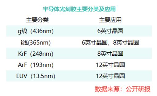 按照曝光波长,半导体光刻胶分为g线、i线、KrF、ArF、EUV五大梯队。光刻胶波长越短,精度越高,国产化率越低。