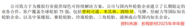 公司主营业务包括酚醛树脂、粘合树脂等橡胶材料,广泛应用于轮胎、新能源汽车、半导体材料等领域,客户名单中不乏普利司通、米其林、固特异等全球轮胎巨头。